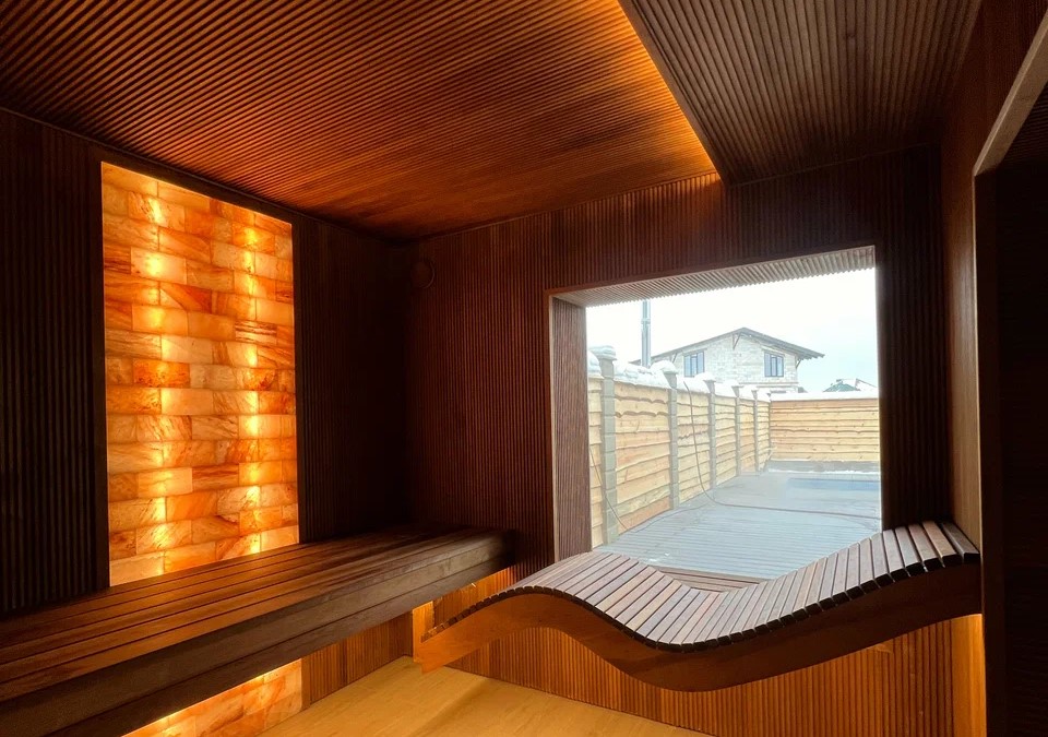 Первая зона выполнена в современном стиле, отличающимся элегантностью линий и утончённым дизайном. Парная оснащена дровяной печью Ялта, которая наполняет помещение мягким паром, способствуя глубокому расслаблению и восстановлению сил. Панорамное окно открывает прекрасный вид на тёплый бассейн.