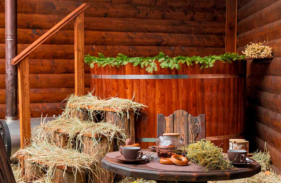 В комплексе уникальные срубы бани с бассейнами и общественный термальный комплекс с собственной кухней. В качестве сопутствующих услуг можно приобрести индивидуальное парение, массаж и прочее.