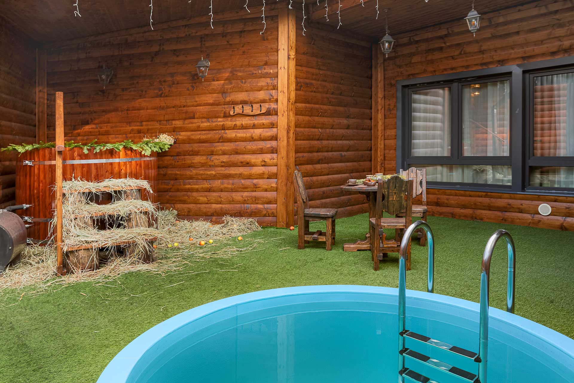 Для гостей оборудована аквазона с просторной помывочной и двумя купелями — с холодной и тёплой водой, что позволяет полностью расслабиться и насладиться водными процедурами. Любители активного отдыха оценят большой бассейн, где можно освежиться и зарядиться энергией.